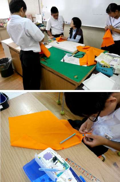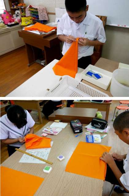 1年生の家庭科ではランチョンマットを作っています。ふちの処理が細かくて、生徒たちは集中しています。なかなかうまくいかない人もいて苦労しています。