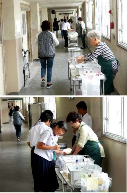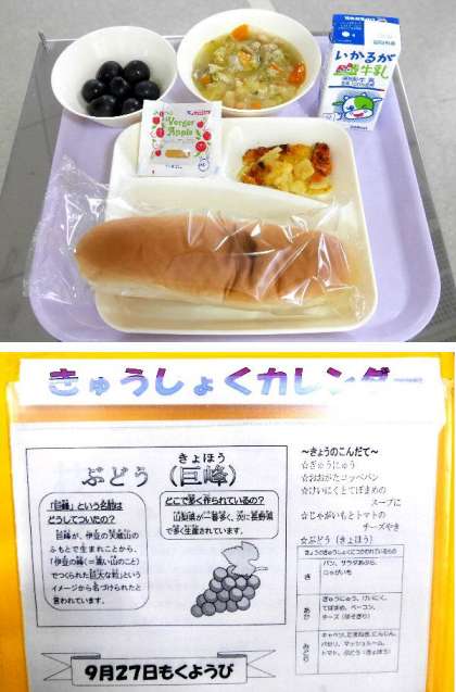 今日の献立は、大型コッペパン、牛乳、鶏肉と豆のスープ煮、じゃがいもとトマトのチーズ焼き。巨峰ぶどうでした。秋の味覚ブドウは種無しでたべやすく、とても甘いのでおいしかったです。