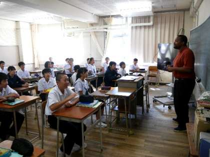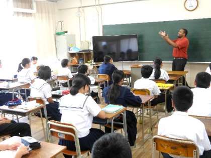 本校に来てもらっている英語ネイティブのアサンテ先生の1年生の授業です。まちがってもいいので、どんどん言葉をだしていこう。コミュニケーションは多いほうが身につきます。