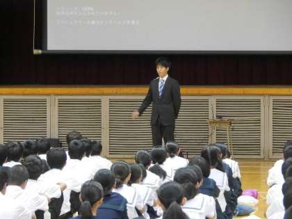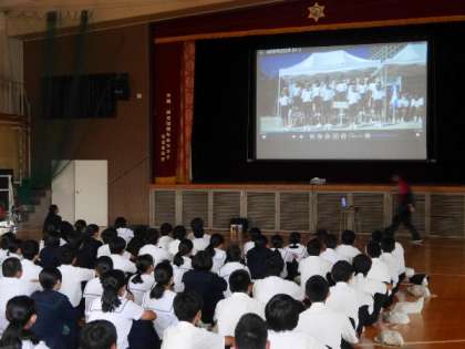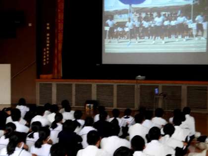 今日は2年生の全校集会が体育館で朝の学活のときにありました。学年集会で先日の体育大会の応援合戦のビデオを見ました。また、教育実習の先生から明日で最後となるので挨拶がありました。