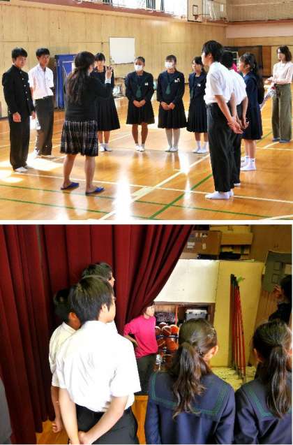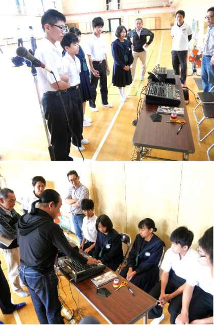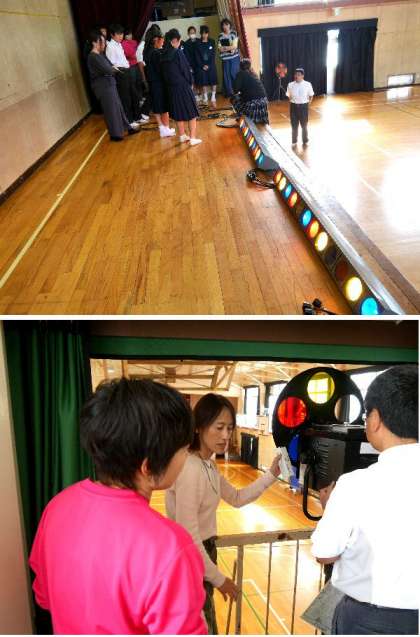 中間テストが終わった今日、体育館の舞台発表のため、音響と照明生徒の係打ち合わせを行いました。音楽の出し方や、照明の操作などの説明を聞いて練習しました。