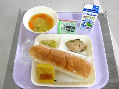 今日の献立は、大型コッペパン、牛乳、鶏肉の香草焼き、スープ煮、サワーキャベツ、ソフト黒豆でした。