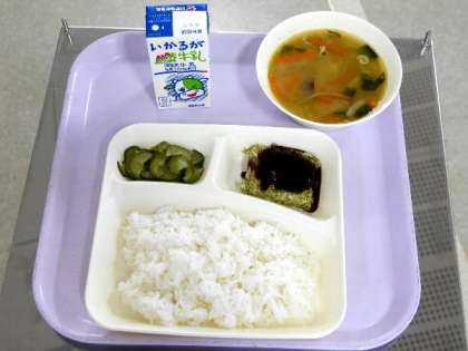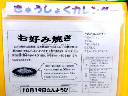今日の献立は、ごはん、牛乳、お好み焼き、豚汁、キュウリの梅風味です。