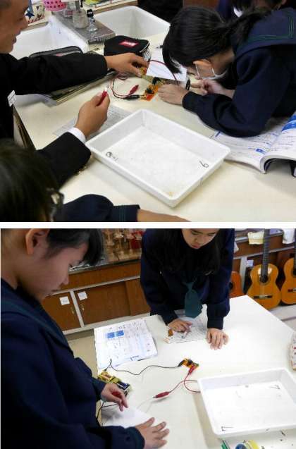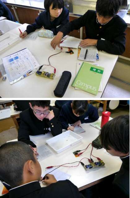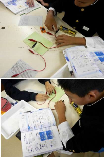 2年生の理科では、電気の直列回路と並列回路を学習しています。各班ごとに自由に導線を配線したものつくり、中が見えないよう厚紙で挟まれています。この回路を交換しあって、豆電球と乾電池で導線のつながりを調べて、どう配線されているかを推測しています。なかなかむずかしです。真剣に調べているところです。