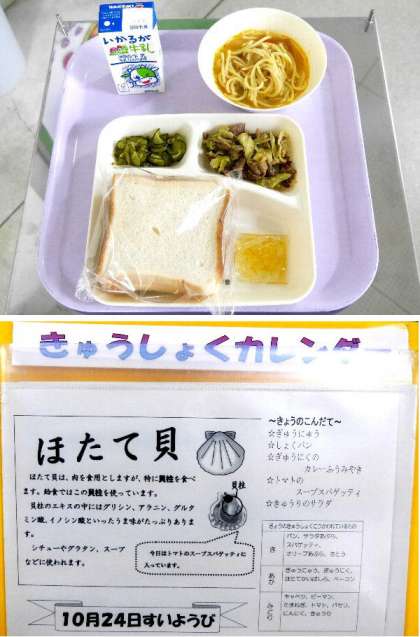 今日の献立は、食パン、牛乳、牛肉のカレー風味焼き、トマトのスープスパゲッティ、きゅうりのサラダでした。