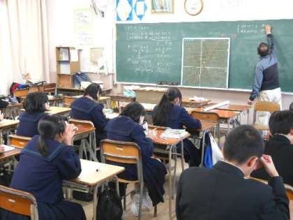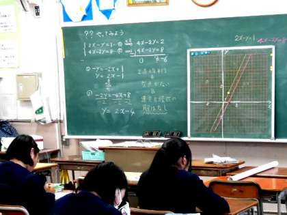 2年生の数学では、一次関数、方程式を学習していますね。2年生になるとどんどん難しくなってきます。少人数で授業をしており、わかりやすい授業に努めています。