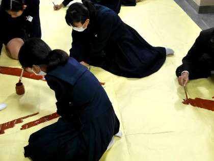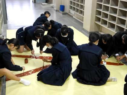 2年生の文化発表会は各学級劇の発表です。大道具の担当が大きな背景を画いていました。模造紙を何枚も貼り合わせて大きな大きな絵です。