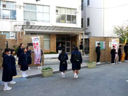 朝の登校時の風景です。風紀委員と生徒会があいさつする少し肌寒い今日この頃です。