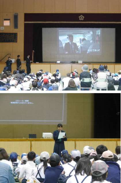 10月27日(土)、新東三国地域の防災訓練がありました、新東三国小学校も土曜授業で児童たちも参加して行われました。東三国中学校からはジュニアリーダーたちが参加しお哲だいをしました。東北ボランティア研修の報告を2年生が行ってくれました。