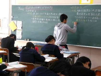 3年の社会科は公民の授業です。政党について学習しています。あと3年たてば、選挙権もありますから、しっかりと考えていきましょう。