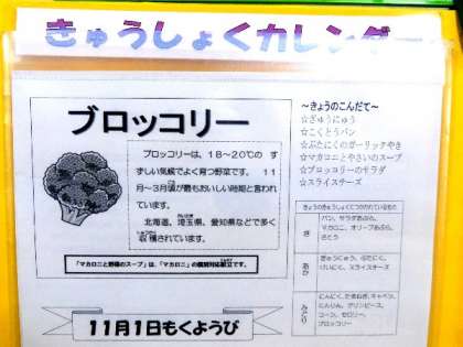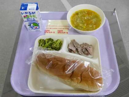 今日の献立は、黒糖パン、牛乳、豚肉のガーリック焼き、マカロニと野菜のスープ、ブロッコリーのサラダ、スライスチーズでした。