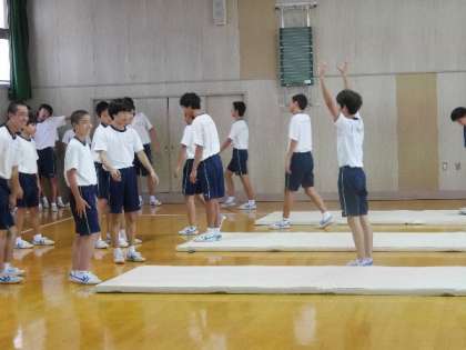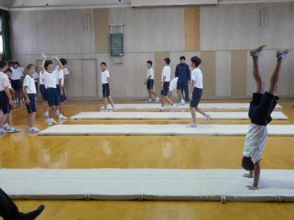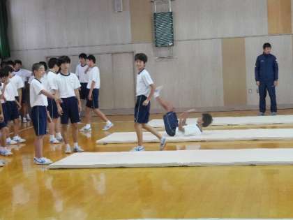 2年生の男子体育の授業は格技室でおこなっています。マット運動のテストをしていました。倒立前転は難しいですね。