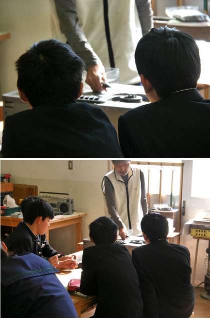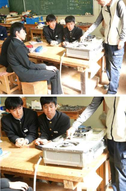 3年の技術の授業です。鉄の焼き入れの実験をしていました。鉄は高温に熱して急冷すると硬くなるんですね。刀の刃先もこうして硬くなってます。