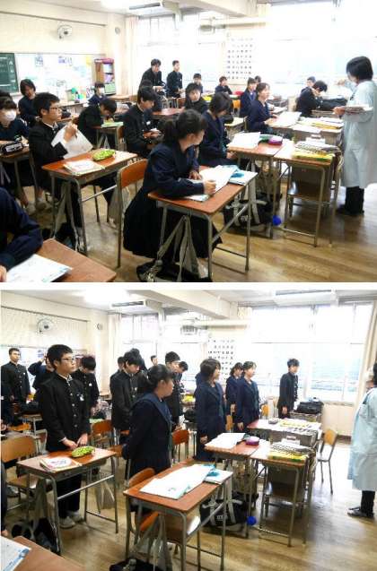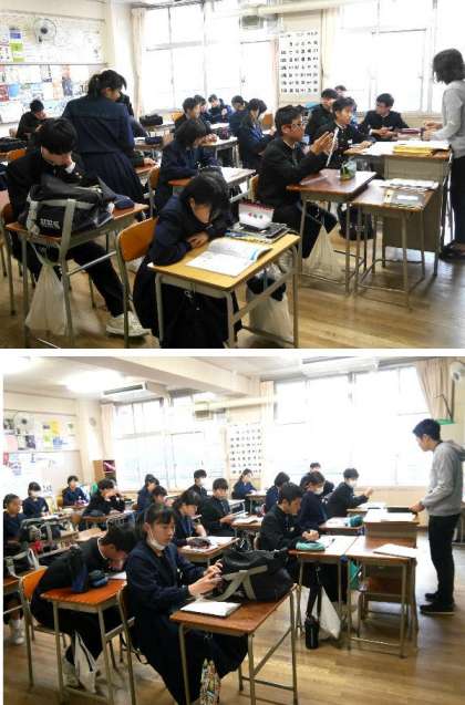 3年生は、始業前の朝の学活で、生徒たちが熱心に教科書をあけて学習していました。朝の学活で社会の小テストがあるんですね。