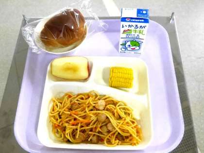今日の献立は、黒糖パン、チキントマトスパゲッティ、焼きとうもろこし、りんご、牛乳でした。