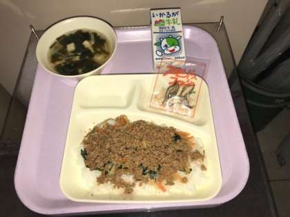 ビビンバ、わかめスープ、牛乳、アーモンドフィッシュでした。