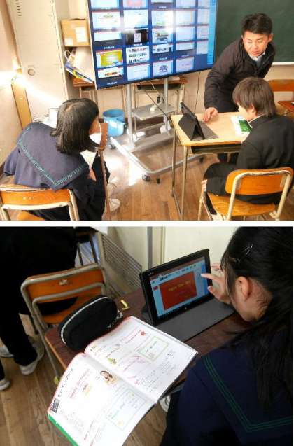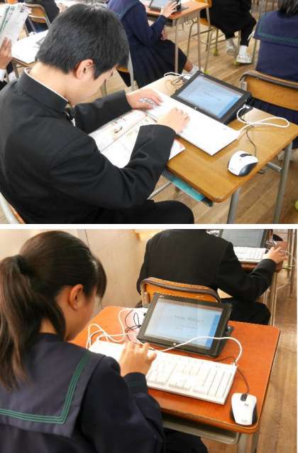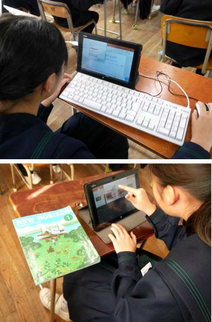 1年生の英語の授業で、英語でグリーティングカードを作っています。タブレットを駆使して教科書の見本を参考にしたり、インターネットで調べたりしながら作っていました。タブレットの操作にはだいぶ慣れて、それぞれの考えたカードづくりに集中していました。