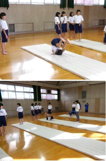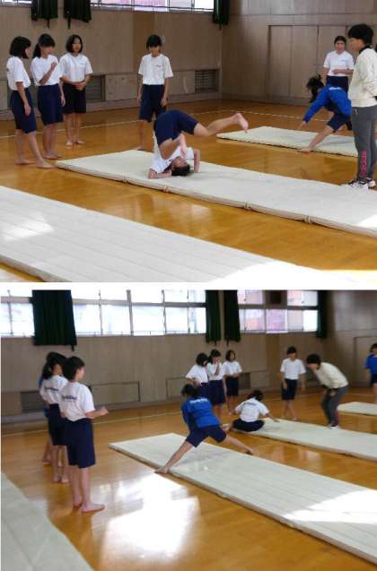体育の授業ではマット運動をしています。だんだんと難しい技にも挑戦です。開脚後転を練習しています。