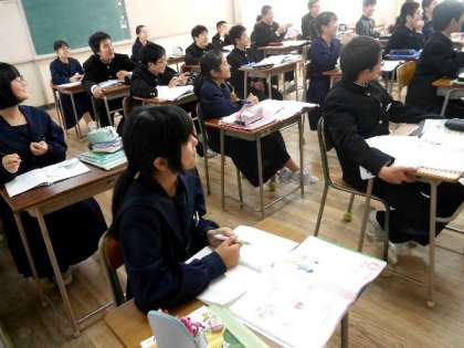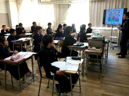 1年生の英語の授業から笑い声が聞こえてきます。全員が先生に目線をむけて楽しそうです。