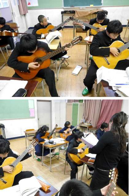 1年生の音楽の授業でギターを練習しています。先生がまわってチェックしています。指がおもうように動かず苦心しています。弾けると楽しいですよ。