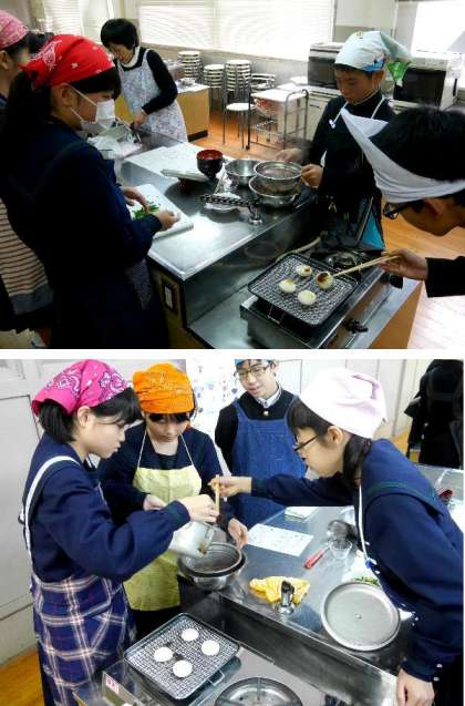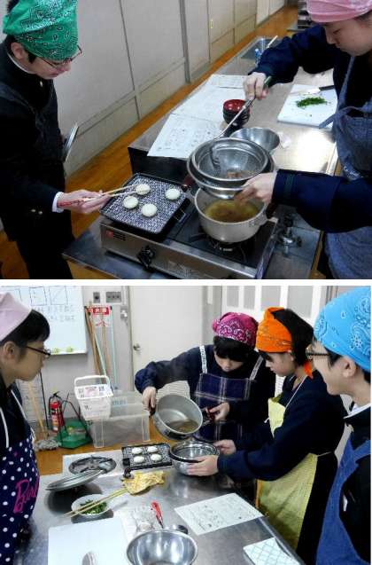 1年生の家庭科の調理実習の授業です。時節柄の料理で、お雑煮です。昆布だしとカツオだしをとって和風だしを作ります。