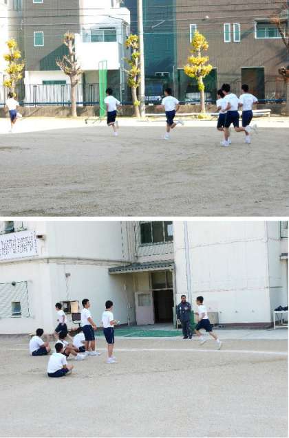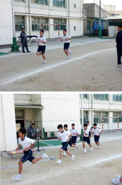 3年生の男子体育では持久走をしています。ペアになってタイムを管理しています。4分をきれるかどうかラストスパートです。
