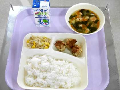 今日の献立は、ごはん、牛乳、あげシューマイ、エビと豆腐のスープ、もやしとコーンのピリ辛あえでした。