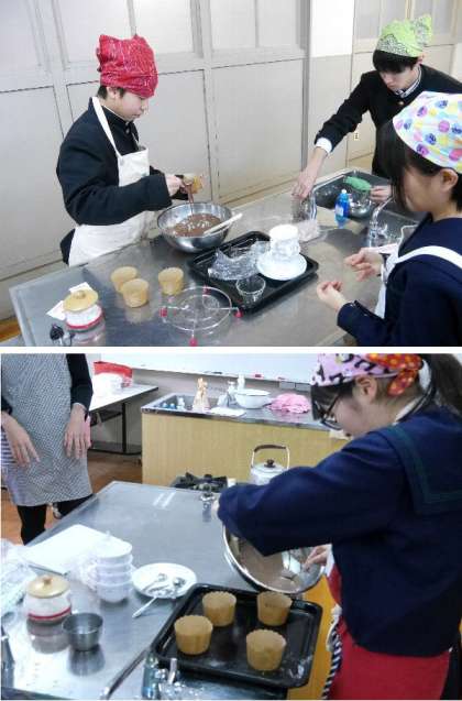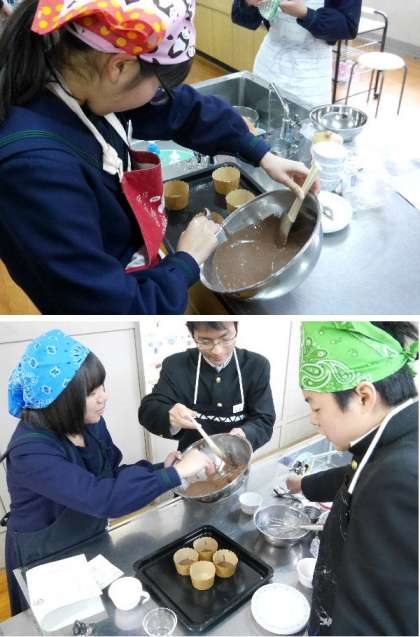 3年生の家庭では調理実習をしています。手作りのお菓子「チョコサプライズマヨケーキ」を作っていました。楽しそうです。今日は2学期最後の授業でした。