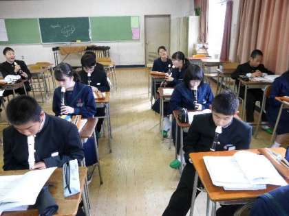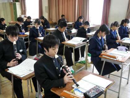 1年生の音楽の授業の様子です。イッツ・ア・スモール・ワールドの「小さな世界」をリコーダで練習しています。