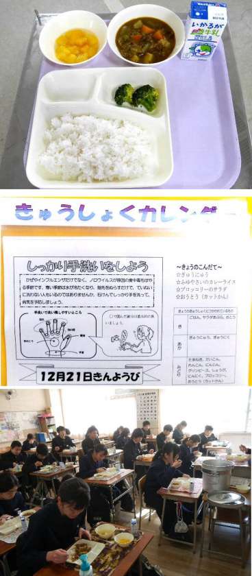 今日の献立は、冬野菜のカレーライス、牛乳、ブロッコリーのサラダ、桜桃(カット缶)でした。今日、2学期最後の給食は、みんなの大好きなカレーライスです。冬野菜のレンコンがたくさん入っていて歯ごたえあるカレーライスでした。