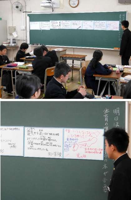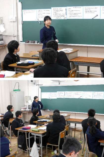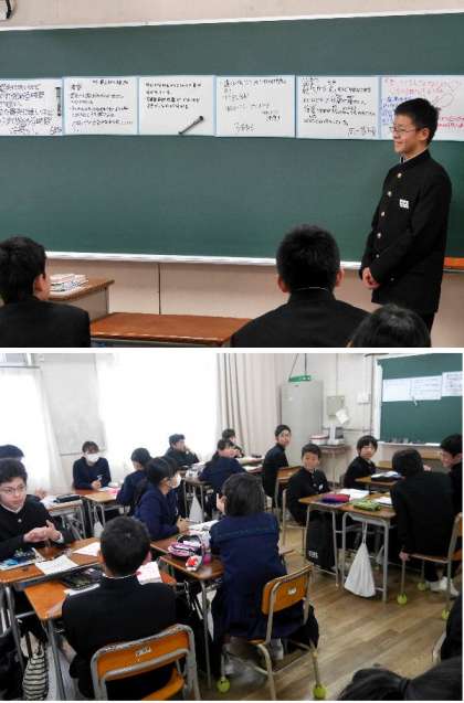 1年生の理科では、地震の広がり方について学習していました。地震発生から各地がゆれ始まるのにかかった時間を書かれた図をみて、班になって考察して話し合った結果を発表しています。みなで考えるとよく頭に入ってくるね。