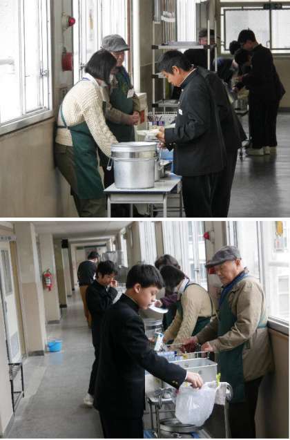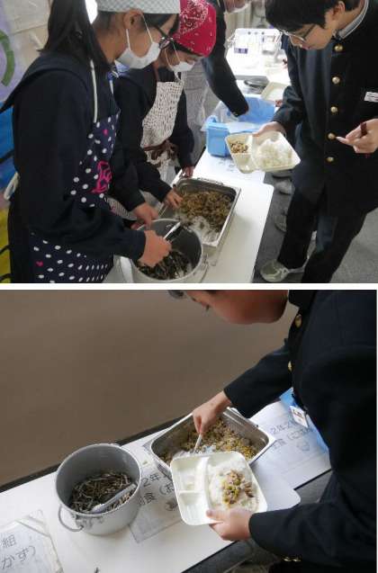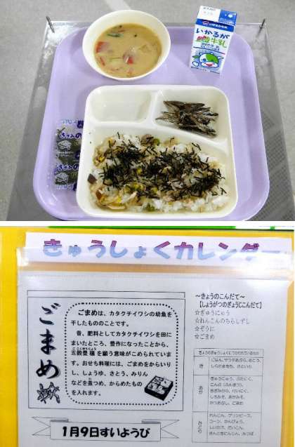 今日の献立は、れんこんちらしずし、牛乳、お雑煮、ごまめで、お正月の行事給食でした。お雑煮にはおいしいお餅がたくさん入っていました。