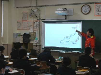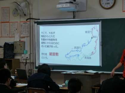 2年の社会では、蔵屋敷について学習していました。プロジェクタを使って、地図を見ながらわかりやすくなっています。