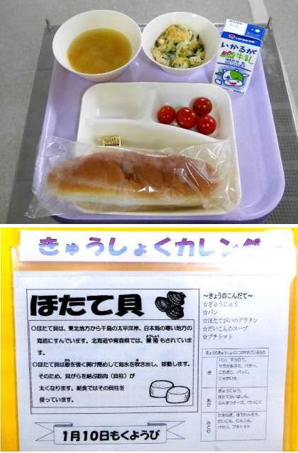 今日の献立は、パン、牛乳、ほたて貝のグラタン、大根のスープ、プチトマトです。
