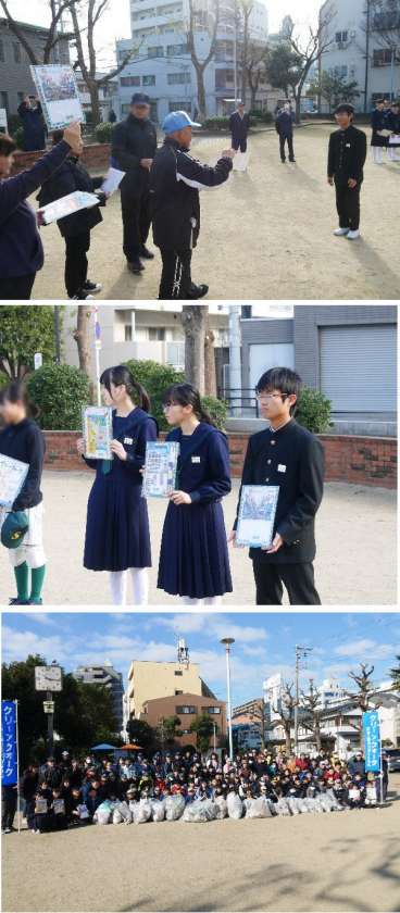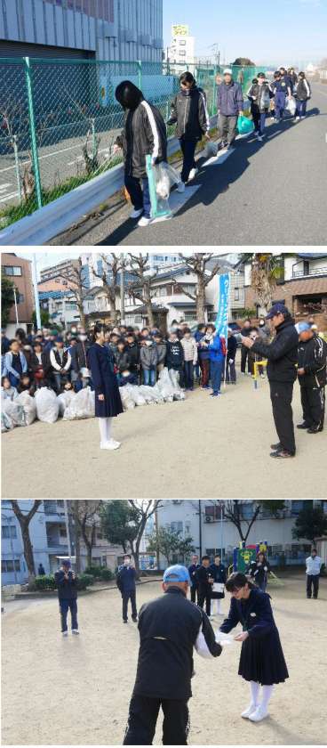 新東三国地域のクリーンウォークにジュニアリーダーが参加して、地域の方々と一緒にたくさんゴミを集めました。クリーンウォーク終了後に、新東三国地域のポスターに採用された3年生3人に表彰がありました。最後に集めたごみを前に全員で集合写真を撮りました。お疲れ様でした。