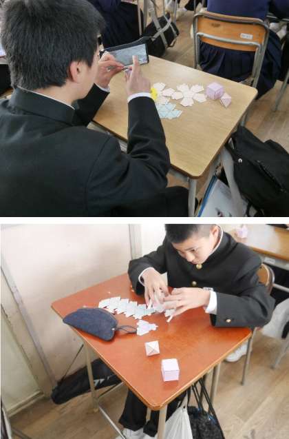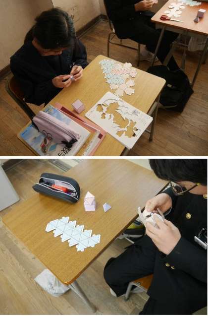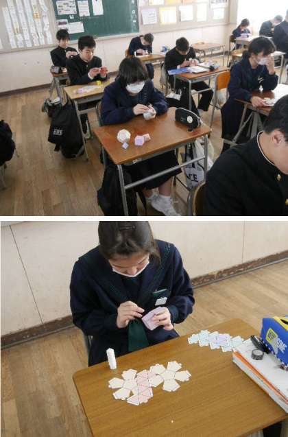 1年生の数学では、いろいろな立体について学習しています。いろいろな立体を比較して共通点やちがいを調べています。教科書にあるページを切り取り、正多面体の立体模型を組み立てています。細かい作業に指先に集中しています。