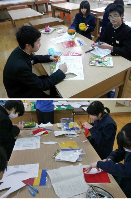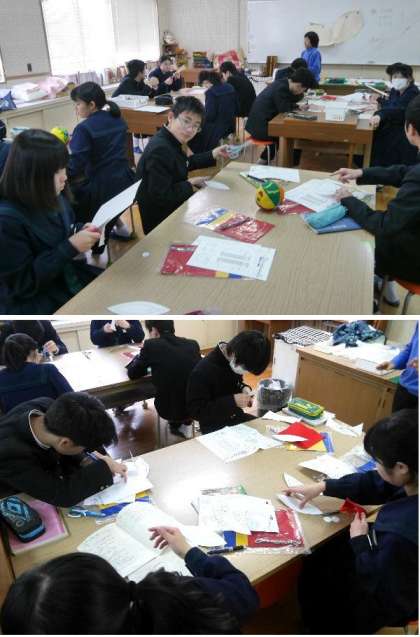 3年生の技術・家庭科の授業は、いつも分割して技術科と家庭科に分かれて授業をしています。技術は教室での授業です。家庭科は家庭科室で幼児用のおもちゃをフェルトで作っています。