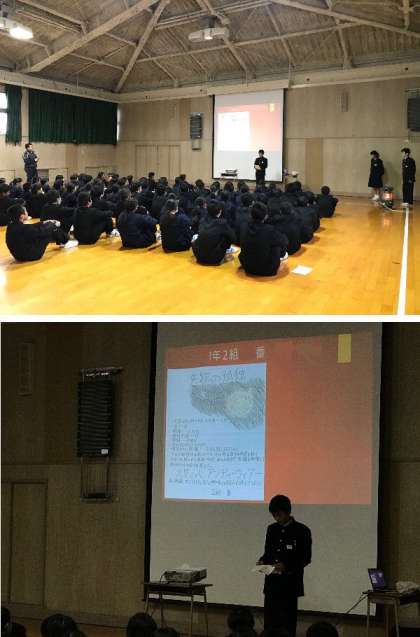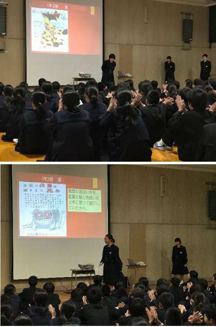 先日、各学級で1年生は読書紹介文の発表をしました。そこで優秀だった生徒が、学年全体の発表会で発表しました。