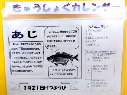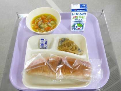 今日の献立は、パン、牛乳、あじのレモンマリネ、スープ煮、固形チーズでした。