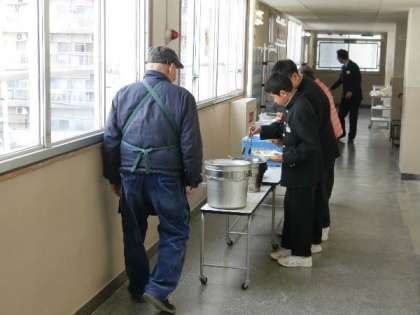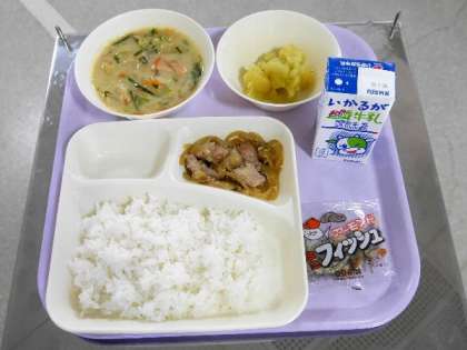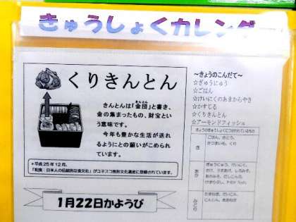 今日の献立は、ごはん、牛乳、鶏肉の甘辛焼き、かすじる、栗きんとん、アーモンドフィッシュでした。