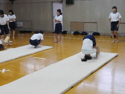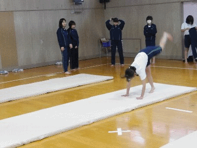 格技室で3年女子がマット運動をしています。高度な技にも挑戦しています。