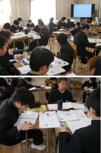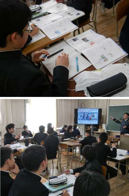 1年生の英語授業の様子です。アメリカの100ドル紙幣にかかれている偉人の話を先生から聞いています。