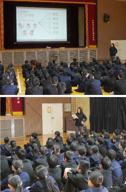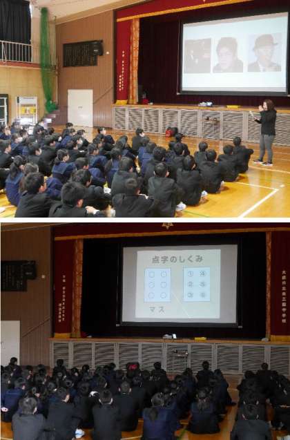 1年生は体育館で視覚障がいについての学習をしました。点字の説明もありました。