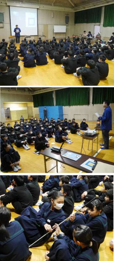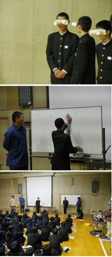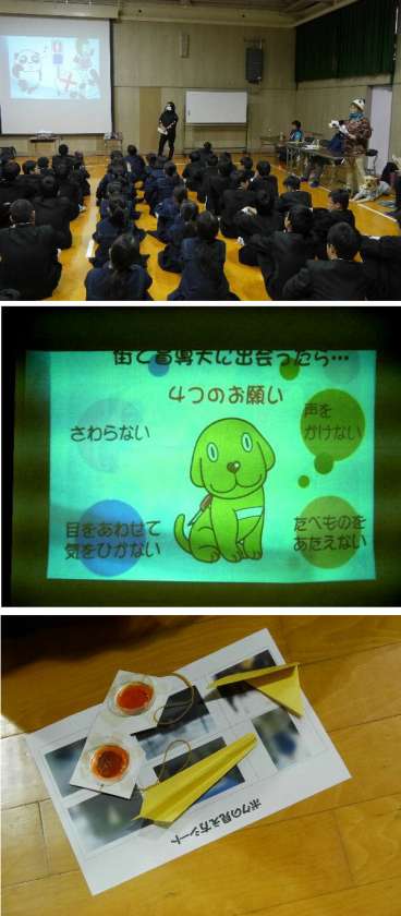 午後から、1年生は視覚障がい支援の体験学習を、淀川区の社会福祉協会などから出前授業にきていただき体験学習を行いました。弱視や視野が狭い視覚障がいをもたれた方に来ていただき出前授業を行っていただきました。盲導犬のクムも一緒にきてくれました。ご自身で作られた紙芝居を見ながら、盲導犬への理解を深めました。また、弱視体験器具を使って、実際に弱視を体験しました。教えてもらわないとわからないことがたくさんありました。