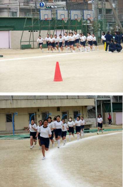 2年生の女子体育は持久走です。半そででがんばっています。