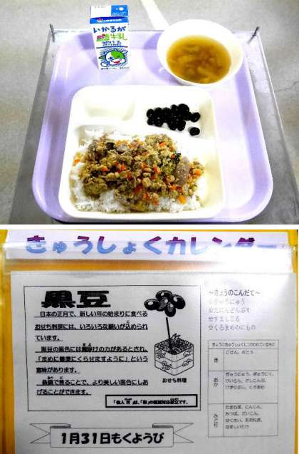 今日の献立は、他人どんぶり、牛乳、すまし汁、黒豆の煮物でした。つゆだくでどんぶりおいしかったです。