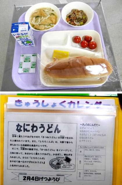 今日の献立は、大型コッペパン、牛乳、豚肉とごぼうの煮物、なにわうどん、とろろ、プチトマトでした。うどんがおいしかったです。