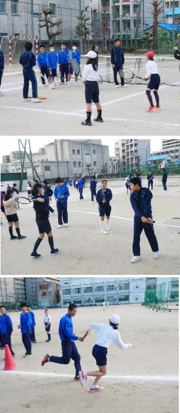 生徒会による中学校説明のあと、小学生の希望にあわせて、それぞれの部活動を体験しました。おとなりの東三国小学校の体育館もお借りして、バドミントン部とバレー部を体験しています。運動場ではテニス部、陸上競技部、野球部の体験、格技室では剣道部です。とても楽しそうに体験していました。中学生は先輩としてやさしく教えてあげていました。