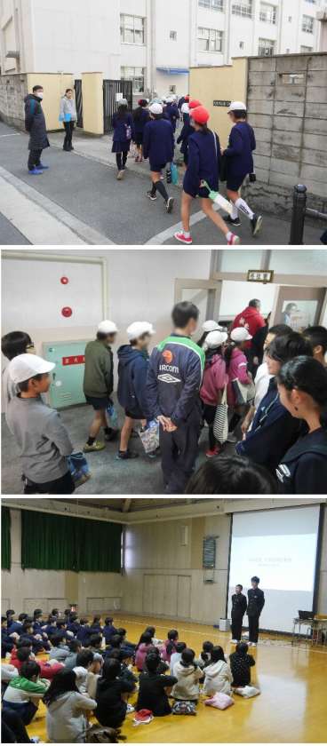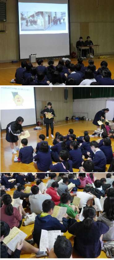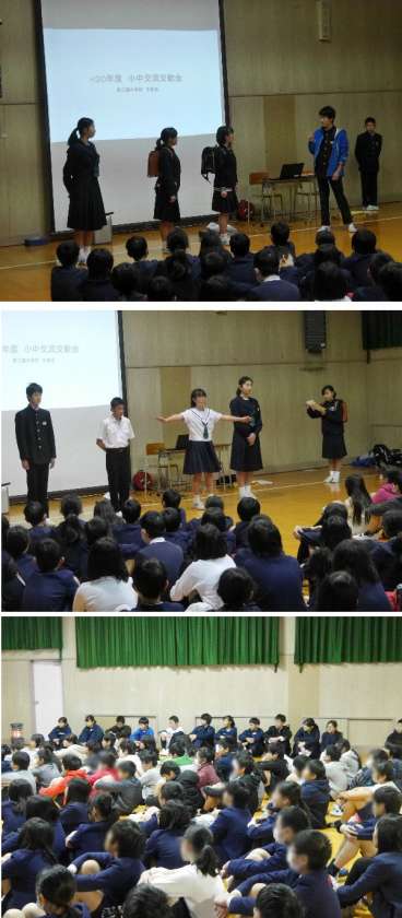 今日は小中交流交歓会として、東三国小学校と新東三国小学校の小学6年生が、東三国中学校の格技室に集まりました。中学校の生徒会の生徒が、中学校生活の1日をパワーポイントで説明したり、小学校とちがう中学校のルールなど劇で説明しました。また、事前に聞いていた小学校と中学校の違うところなど不安な部分のアンケートの結果も発表されました。