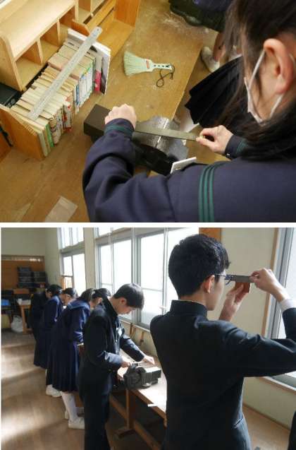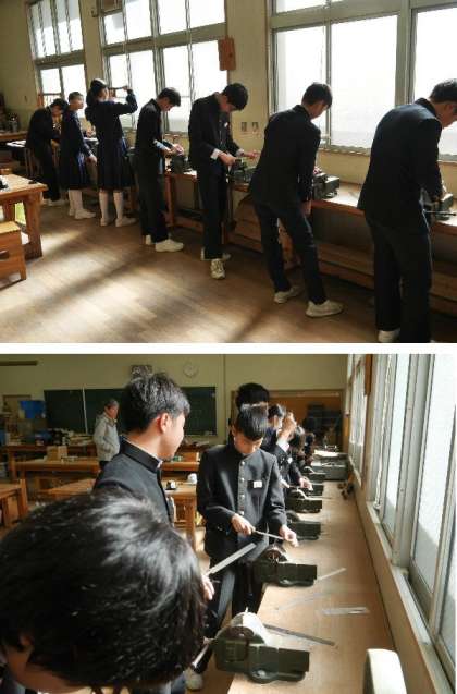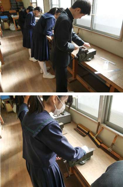 3年の技術では、金属を加工してキーホルダを作っています。まずは、金属をまっすぐに削ることを練習です。直定規をあててまっすぐになっているか確認しながらヤスリをかけていきます。